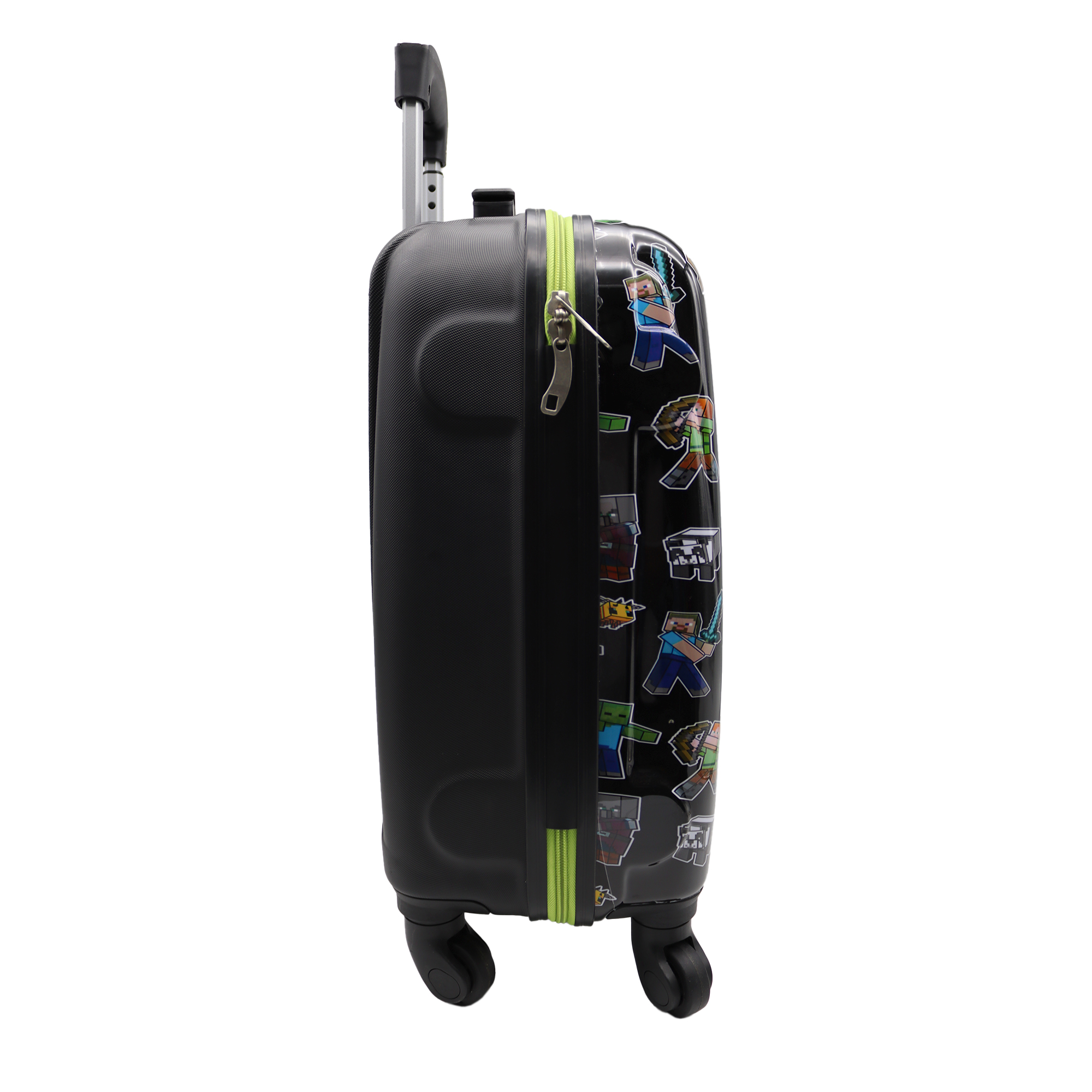 Trolley Cabina Minecraft. 4 ruedas giratorias y multidireccionales. Frontal en policarbonato. Trasera en ABS. Ruedas dobles personalizadas. Forro nylon liso. Maleta rígida muy resistente con asa extensible y cierre de cremallera hecha en el exterior con 95% ABS + 5% policarbonato y forro interior 100% poliéster. El tamaño de la maleta es (50 x 33 x 20 cm.) Cumple con las medidas de las maletas de cabina establecidas por la asociación internacional de transporte aéreo (IATA) lo que la hace apta para viajar en avión.