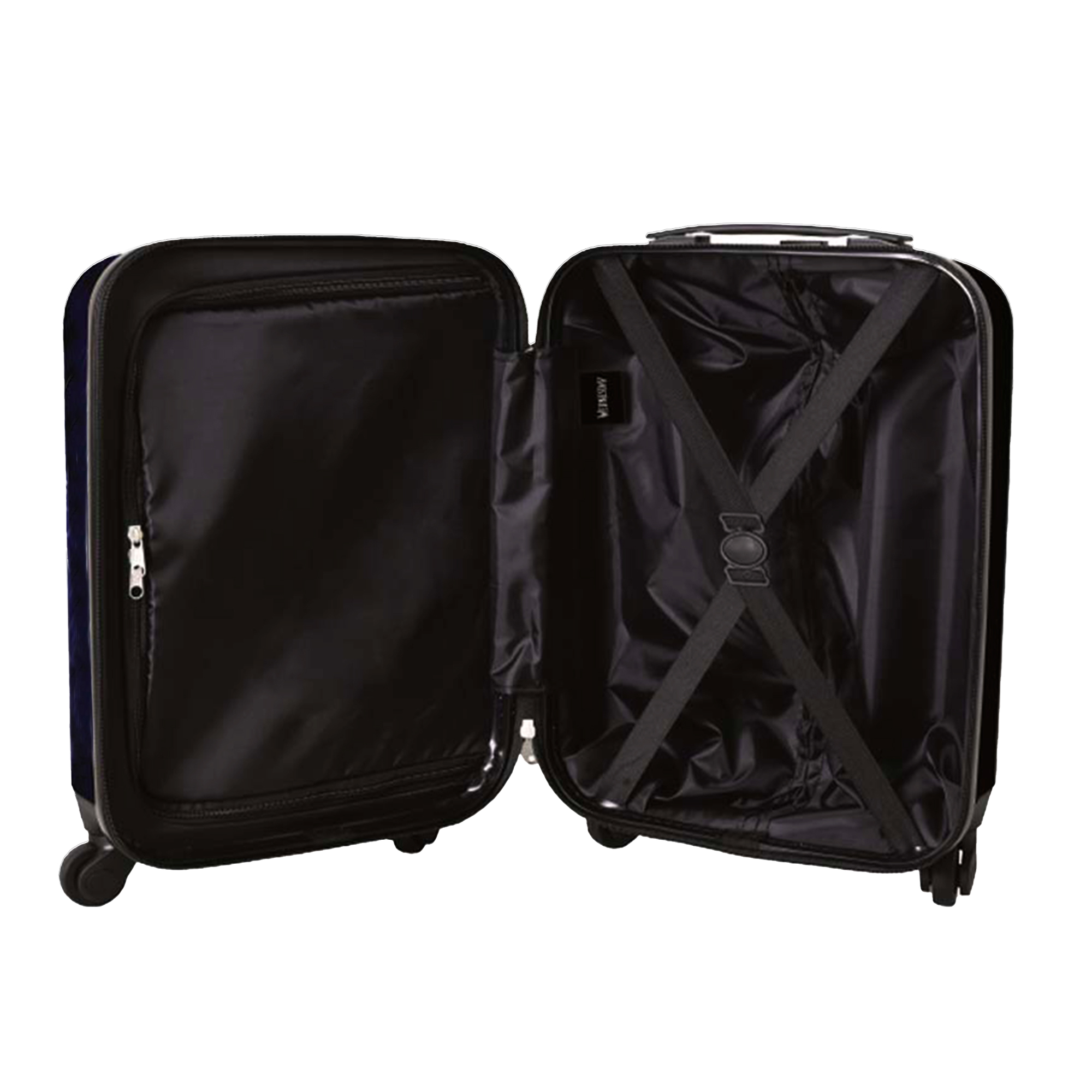 Trolley Cabina Wednesday. 4 ruedas giratorias y multidireccionales. Frontal en film PC impreso. Trasera en ABS. Ruedas dobles personalizadas. Forro nylon liso. Maleta rígida muy resistente con asa extensible y cierre de cremallera hecha en el exterior con 95% ABS + 5% policarbonato y forro interior 100% poliéster. El tamaño de la maleta es (55 x 36 x 22 cm.) Cumple con las medidas de las maletas de cabina establecidas por la asociación internacional de transporte aéreo (IATA) lo que la hace apta para viajar en avión.